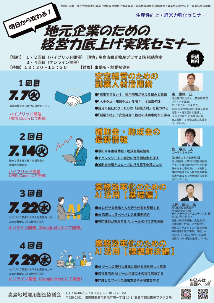2回目は令和8年度の最新補助金情報を紹介します。チェックシートを用いた自社に合う制度の探し方や、電子申請をスムーズに行うための実用的なコツを習得します。